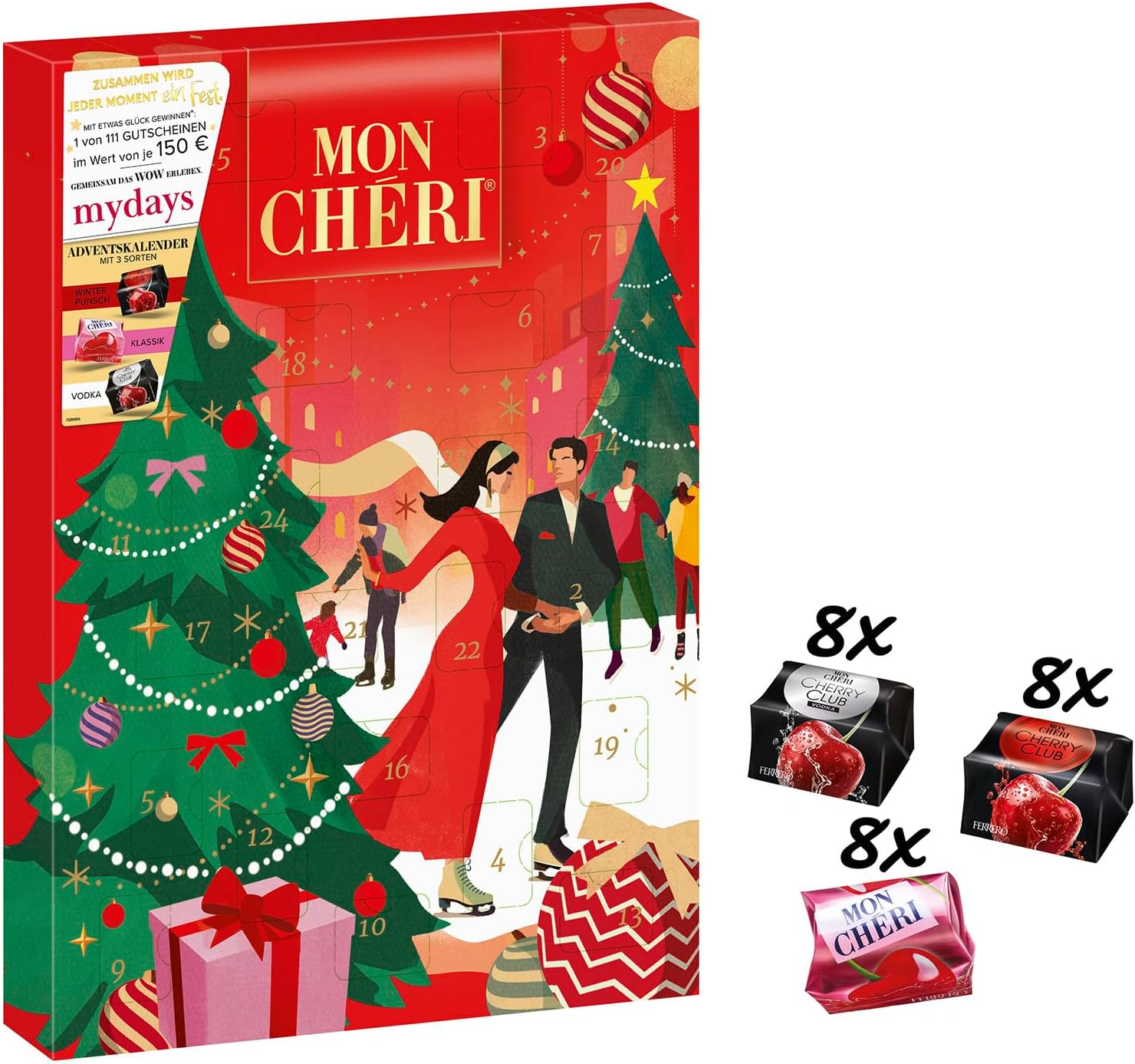 Découvrez jour après jour Mon Chéri Classic, Mon Chéri Cherry Club Vodka et Mon Chéri Cannelle, pour un Noël fruité, gourmand et festif.