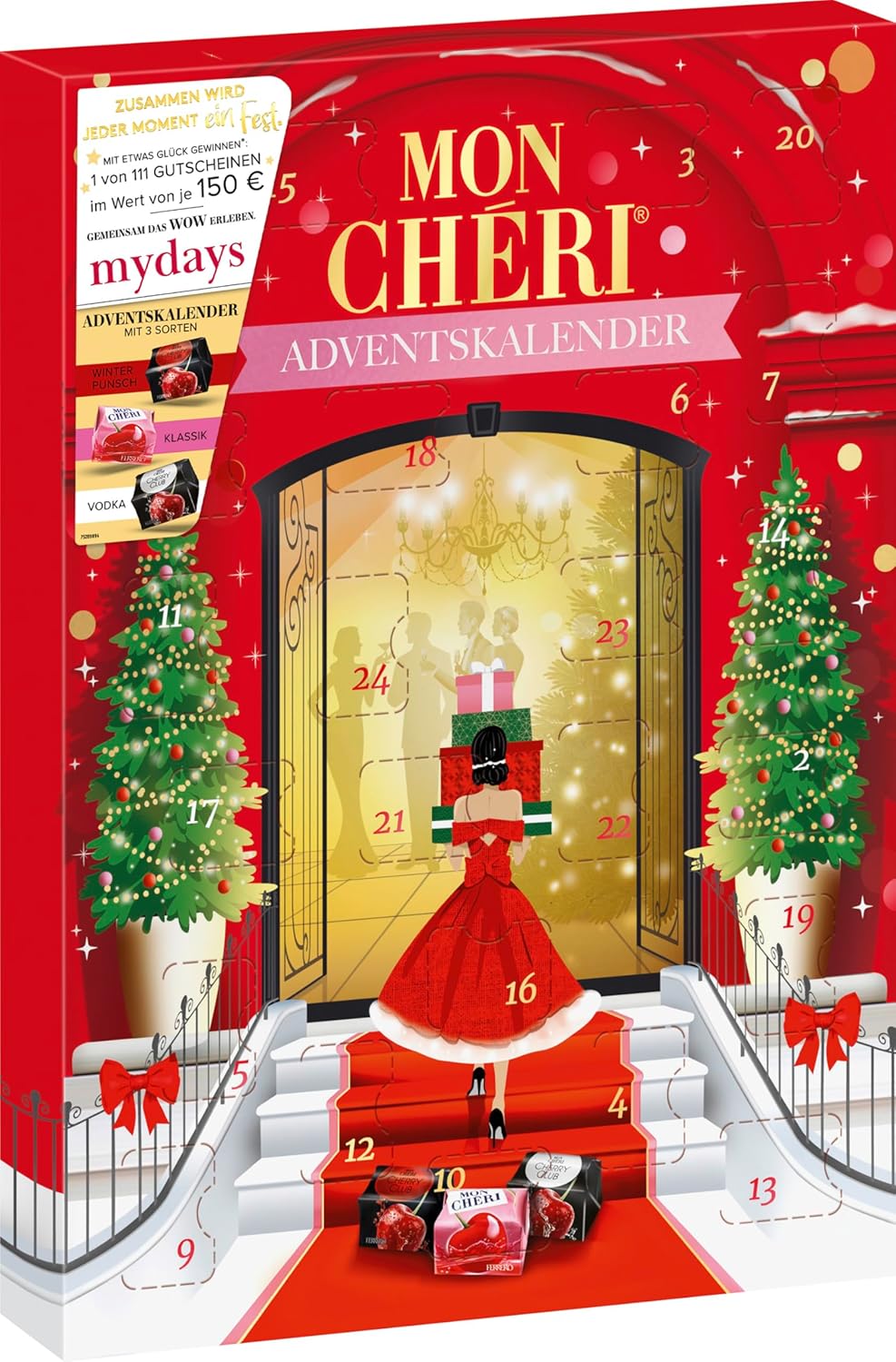 Le Calendrier de l'Avent Mon Chéri 252 g transforme l’attente de Noël en un véritable moment gourmand. 24 cases renferment des chocolats Mon Chéri variés : cerises aromatiques, liqueurs fruitées, chocolat croustillant et touches hivernales de cannelle et clou de girofle.
