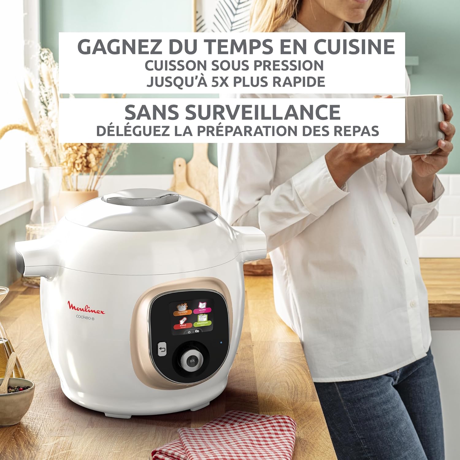 Le Cookeo embarque 150 recettes intégrées directement sur son écran intuitif, et des centaines d’autres disponibles via l’application gratuite My Moulinex. Il adapte automatiquement la cuisson selon les ingrédients, quantités et nombre de convives pour garantir un résultat parfait.